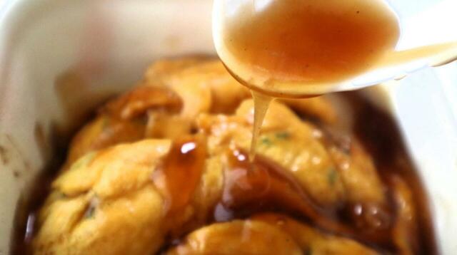 「これ、いったい卵何個分使ってるんだろう…?」と思うほど、ふわふわでボリューム満点の玉子炒めに、醤油ベースの甘酢あんがたっぷりとかかっています。