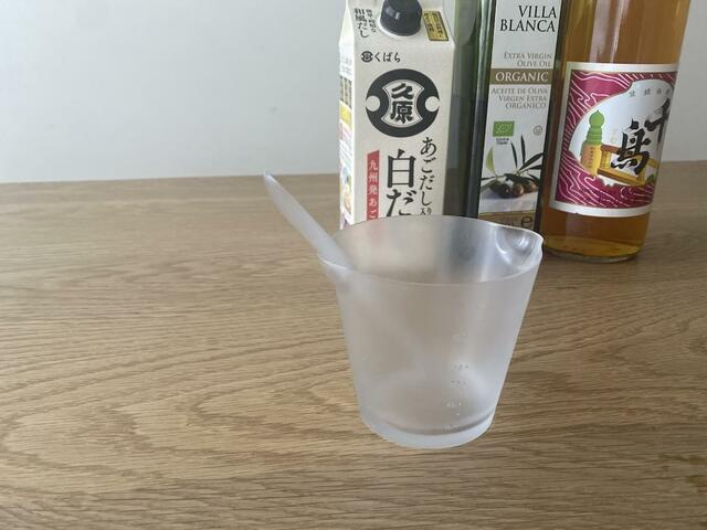 ドレッシング作りにちょうどいい大さじ5杯分まで計れる15ml単位のメモリと、100ml、150mlのメモリが入っています。