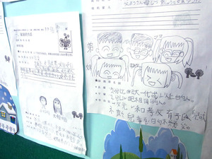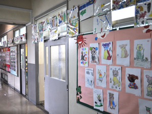 中国語と日本語の掲示物が混ざる小学部の教室前