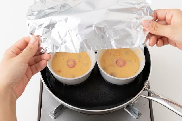 4. フライパンに水を注ぎ、3を並べ入れ、アルミホイルをかぶせて15~20分蒸す(蒸している間に水がなくなったら追加する)。
