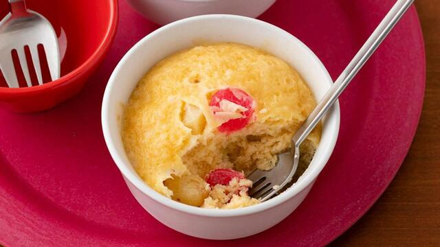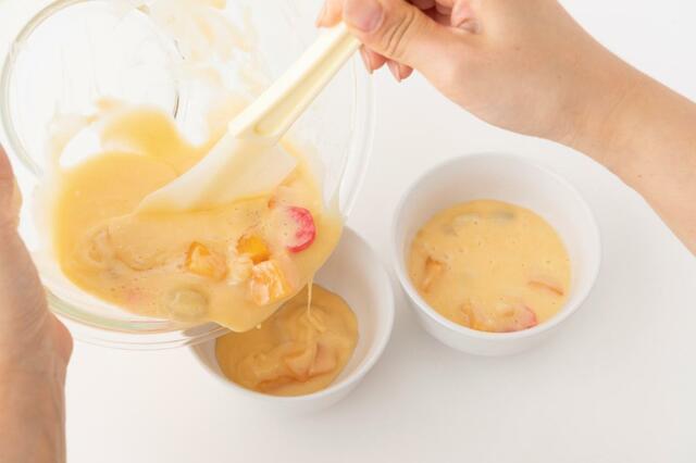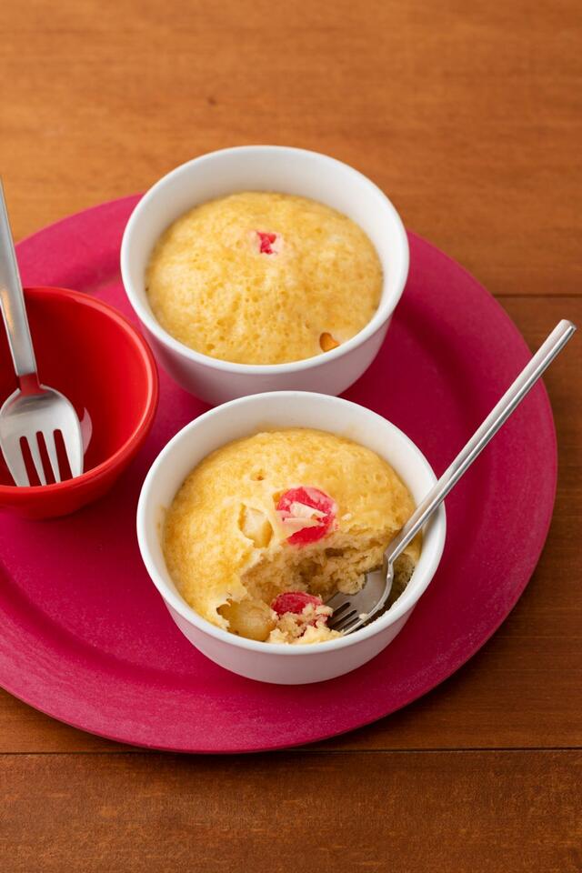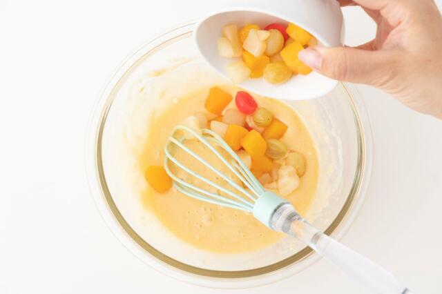 <材料(150ml容器2個分)>ホットケーキミックス…80g 卵…1個 フルーツミックス缶(汁なし)…100g 【A】フルーツミックス缶の汁…大さじ2 砂糖…大さじ1 牛乳…大さじ1 サラダ油…大さじ1 水…400ml <つくり方>