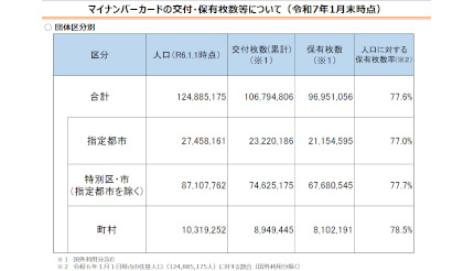 2025年1月末時点のマイナンバーカードの保有枚数率は全国77.6%