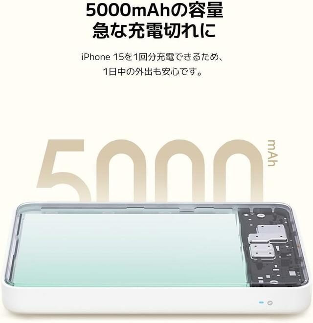 バッテリーの容量は5000mAh。iPhone 15を約1回分充電できるので、1日中の外出も安心です。スマホの充電切れの際の予備バッテリーとして持ち歩くのにも最適なアイテムです。