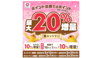NTTドコモは「ポイント交換でdポイント最大20%増量キャンペーン」を3月1日から3月31日まで実施する。エントリーはすでに受け付けている。