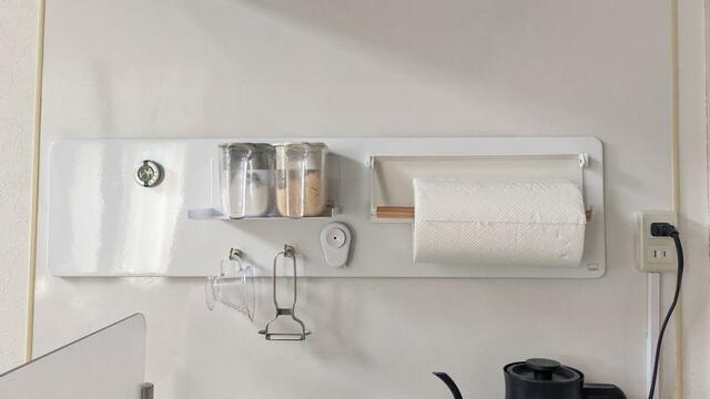 わが家ではまず、キッチンペーパーホルダーと調味料入れを置く棚を設置しました。