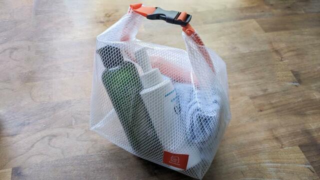 このスパバッグは分厚い樹脂素材を折りたたんで使うので、液体が漏れにくいのもポイントです。