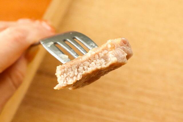 食べてみると違いが明確! 使っていない方はモサモサとした食感だったのに対し、「お肉やわらかの素」を使った方はしっとりジューシーなんです。