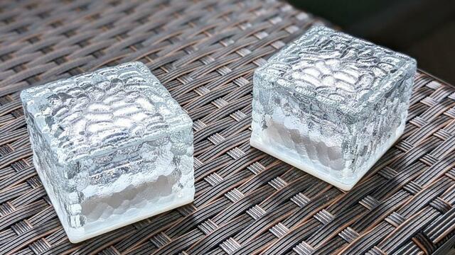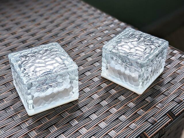 サイズは縦7cm、横7cm、高さ5cmのキューブ型で、約330g。ガラスの質感が美しく、チープな感じはありません。
