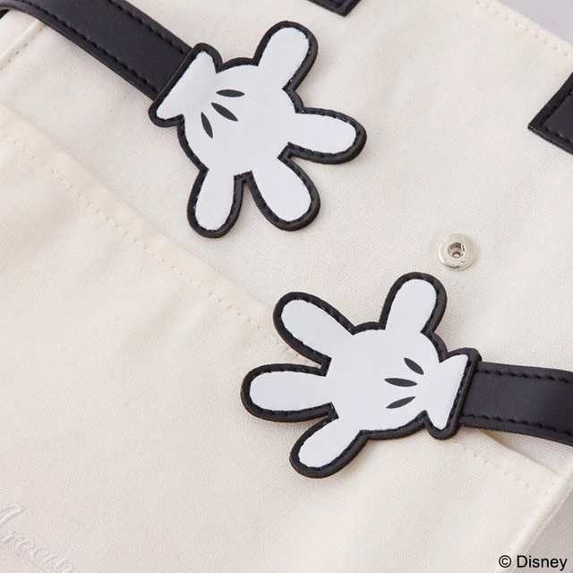 「ミッキー」の両手がぎゅっとかばんを抱きしめているようなデザインで、手のモチーフはスナップボタン付き。