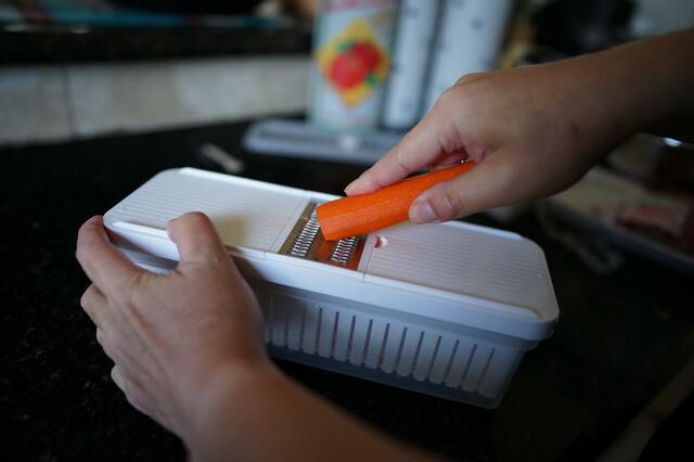 スライサーのほかにも、刃で指を切らないように「ケガ防止指ガード」がついているので、子どもでも安心してスライスできます。
