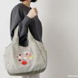 巾着バッグは、表面、背面、底部とそれぞれ異なる素材が用いられているのが特徴。