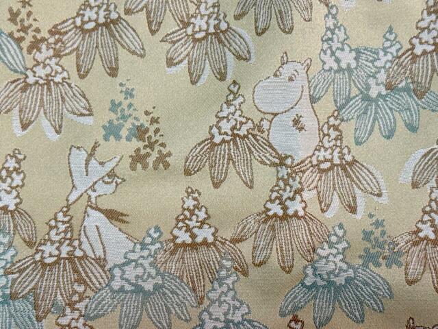 お花とムーミンの総柄のジャガード織りで、とっても豪華。みているだけでうっとりしてしまいそうな、美しい生地です。