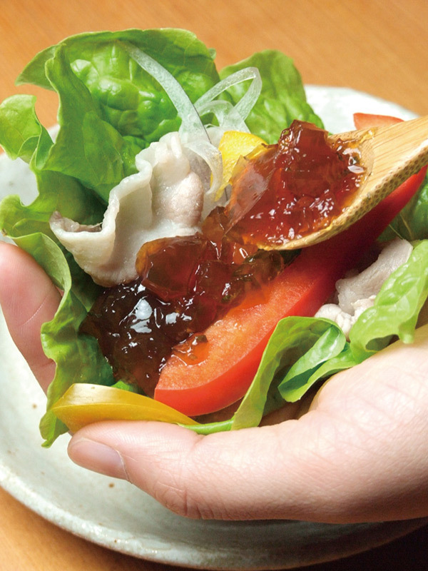 夏季限定!『巻きしゃぶ』 1人前1800円(税別) きめ細やかな鹿児島産黒豚を野菜で巻いて食べるしゃぶしゃぶ。レタスのみずみずしさと豚の甘味の妙味が楽しめる。注文は2人前より