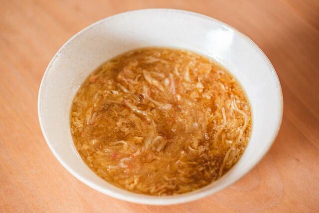 水溶き片栗粉でとろみをつけて、最後にかに玉を流し入れたら完成です。