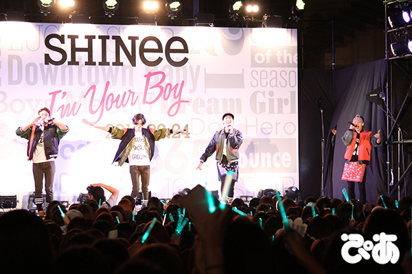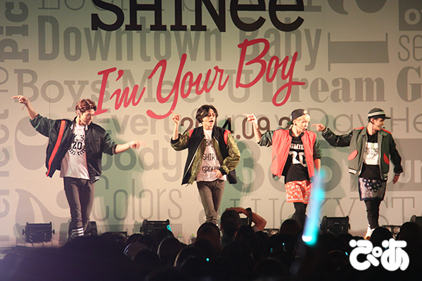 さらに、会場のファンが、「I ◆ SHINee」(◆=ハート)と書かれたメッセージカードを一斉に掲げるサプライズもあり、これにはメンバーも大喜び。目を輝かせながら、ファンとともに「I Love SHINee!」とうれしそうに叫び、アルバム収録の新曲『Downtown Baby』でイベントを締めくくった。