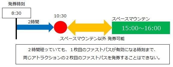 もちろん、同じスペースマウンテンのファストパスも発券できます。ただし、最初に発券したファストパスが「15:00~16:00」となっている場合は、いくら2時間以上経っていても、15:00以降でないとスペースマウンテンのファストパスを取ることはできません。