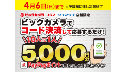 ビックカメラグループは、「ビックカメラ」「コジマ」「ソフマップ」の店舗で対象のスマートフォン決済サービス(コード決済)で税込1000円以上支払うと、抽選で10人に1人5000円分のPayPayポイントが当たる「PayPayポイントが当たっちゃうキャンペーン」を2月21日から4月6日まで開催する。