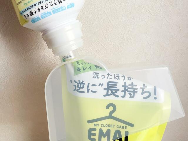 普段使っているシャンプーと違って、おしゃれ着用の洗剤はサラサラしているため、ひっくり返す前にボトルをセットしておきます。