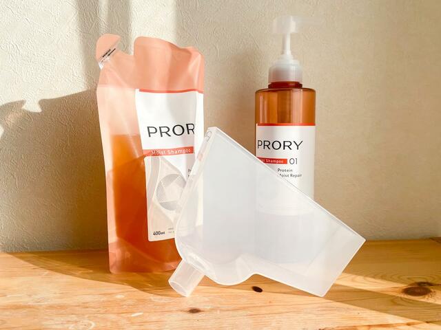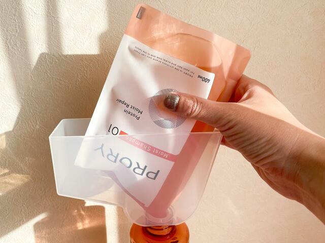 シャンプーやトリートメントを詰め替える際、全部入れ終わるまでパウチを持っていないといけないのがプチストレス。