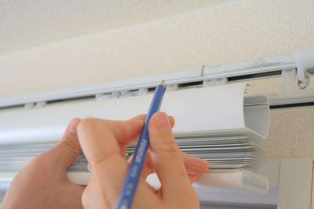 まず、備え付けカーテンレールに取り付けたいブラインドの枠を合わせ、「FABJERG」を設置する位置に目印をつけます。