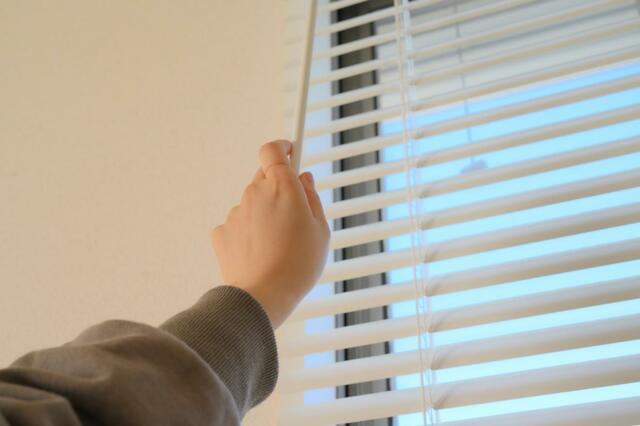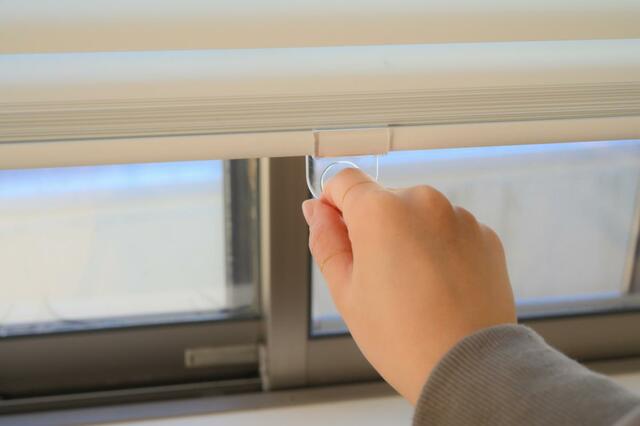 紐で昇降するブラインドもありますが、こちらは透明の取手に指を引っ掛けて高さを調整する仕様。