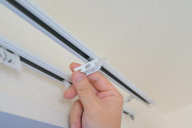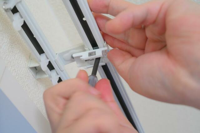 続いて備え付けカーテンレールの端についているストッパーを外し(ドライバーで外れるか要確認)、レールに「FABJERG」を通します。