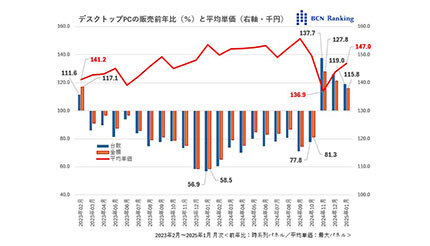 デスクトップPCが賑やかだ。起点は昨年11月。販売前年比が台数で137.7%、金額でも128.7%と久々の大幅増を記録した。この1月も台数119.0%、金額115.8%と2桁増を維持している。実はこの2年弱、デスクトップPCは不調を極めていた。最後に前年を上回ったのは2023年2月。以降ほとんどの月で2桁割れが続き、昨年1月に至っては台数56.9%、金額58.5%と半減に迫る状態だった。その間、平均単価(税抜き、以下同)は15万円前後で推移して高止まり。ところが昨年11月、平均単価が13万6900円まで急落、販売が一気に上向いた。全国2300店舗の家電量販店やネットショップの実売データを集計する、BCNランキングで明らかになった。