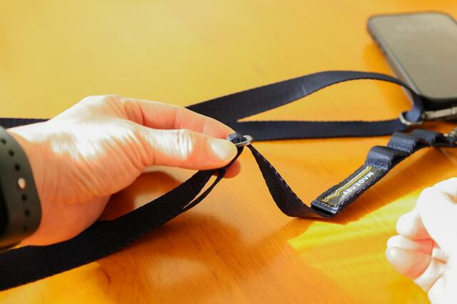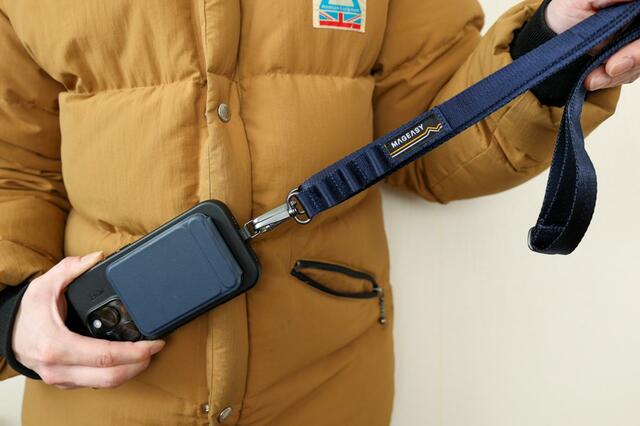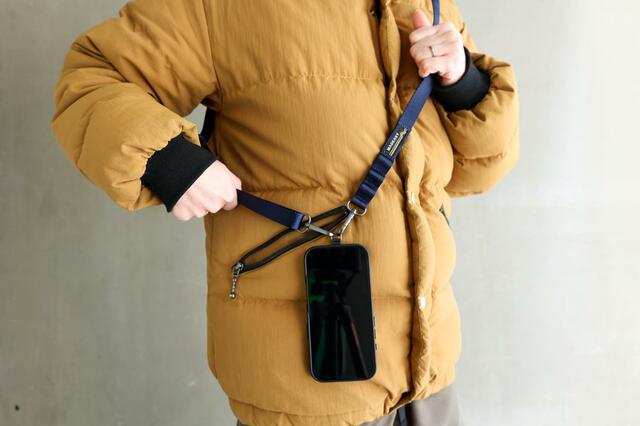 スマホに装着すれば、首からかけたり、ショルダーバッグのように斜めにかけたりできて、とても便利。