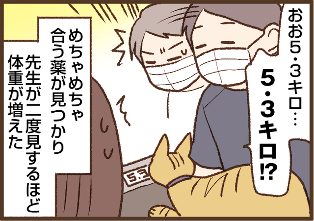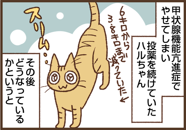 ハルちゃんは投薬を開始してから本当にしばらくまったく体重が増えず、しかも途中で別件の手術などもあって(過去に漫画にも描きましたが…)それ自体はうまくいったものの、本来の姿に戻るにはまだまだ遠く…という感じだったので、この劇的な体重復活は本当に嬉しかったです。