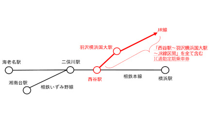 2025年3月15日以降、「YOKOHAMA どっちも定期」の対象区間に加わる「西谷駅~羽沢横浜国大駅~JR線区間」のイメージ