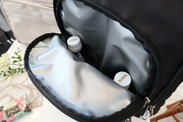 リュックのポケット裏面が保冷バッグ仕様になっているのが最大のポイント!ペットボトルが2本も入るサイズなので別途保冷バッグを持ち歩く必要がなく、夏はもちろん冬でも活躍しそうです。