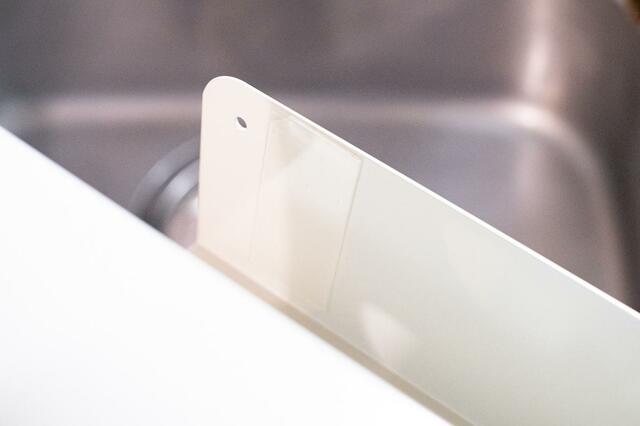 内側に繰り返し貼り付けられる粘着テープが付いていて、棚にピタッとくっついてくれます。