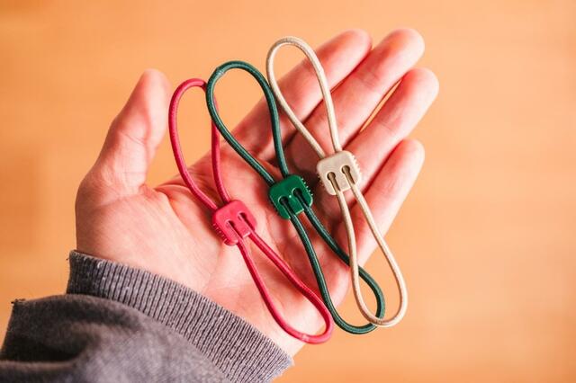 使い方はシンプルで、ゴムバンドの片側の輪っかに通してから、ストッパーをギュッと絞るように動かすだけ。