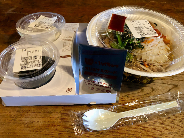 テイクアウト商品は、ビビンバ丼とおんたま、やみつき海苔、甘辛コチュジャンソースが別々の容器に入って提供されました。それぞれ好みの量を好みのタイミングで追加できるのが良いです。