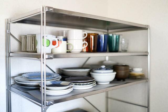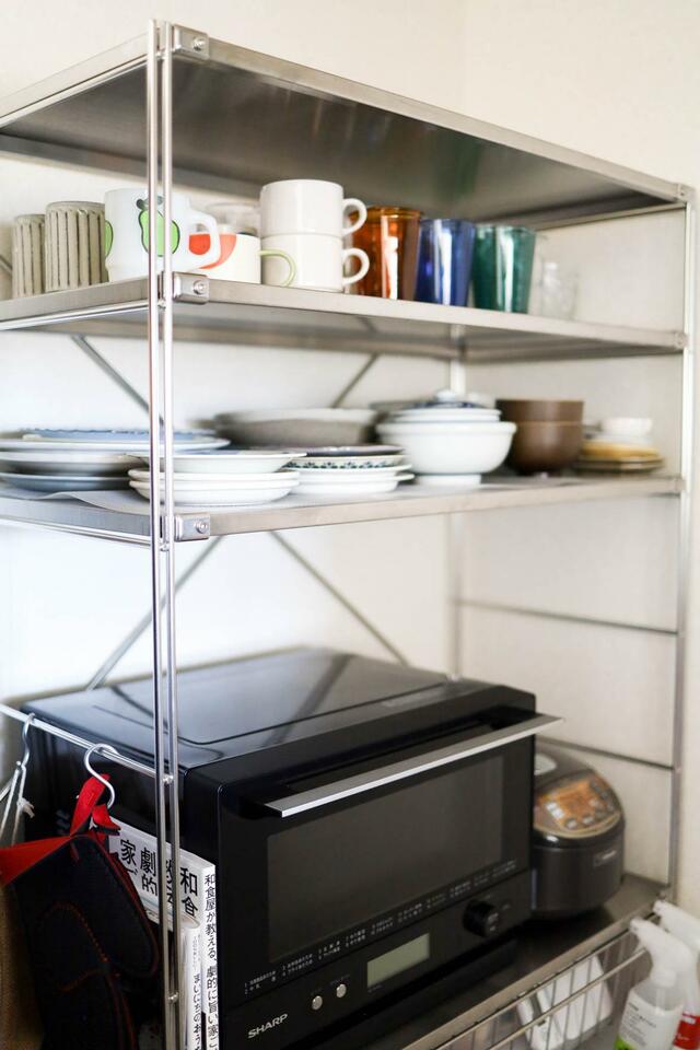 上段は食器棚として、中段は家電置き場として、下段は収納スペースとして使用中。食器はオープン収納にすることでひと目で把握でき、出し入れしやすいのが◎ 落下防止のため下には滑り止めシートを敷いています。