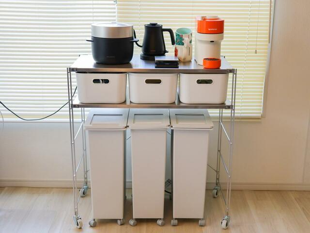 上段には炊飯器やケトルを置いて、ご飯をよそったりコーヒーを淹れたり。その下には無印良品の「やわらかポリエチレンケース・中」を3つセット。ここにテーブル調味料や小皿を入れています。