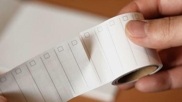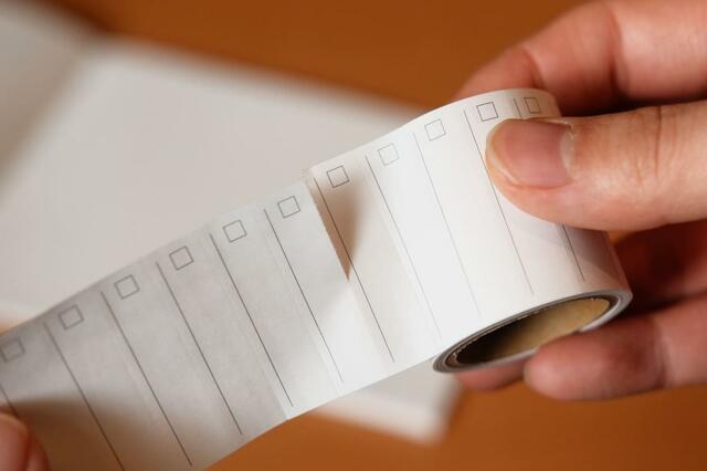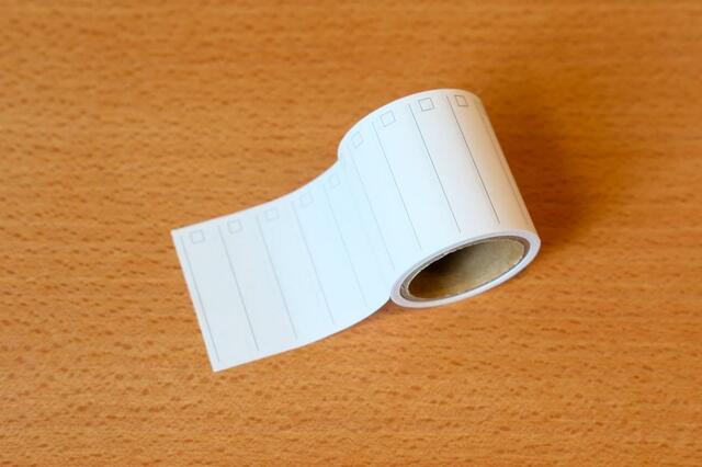 商品名のとおり、全面にのりがついたロール状の付箋。そこに、チェックボックスと書き込みやすい目安線が印字されています。