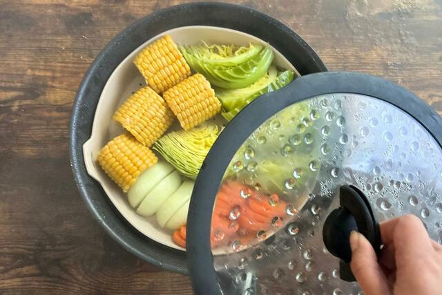直径26cm以上のフライパンの底に水を張り、シリコンスチーマーを乗せたら、蓋をして火にかけます。あとは完成まで待つだけ。