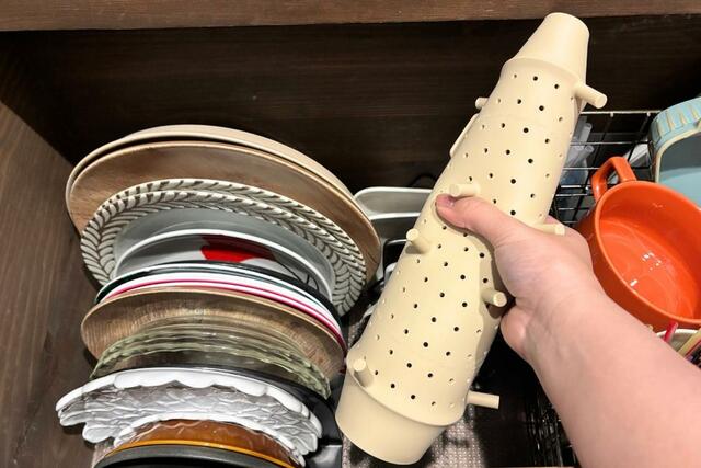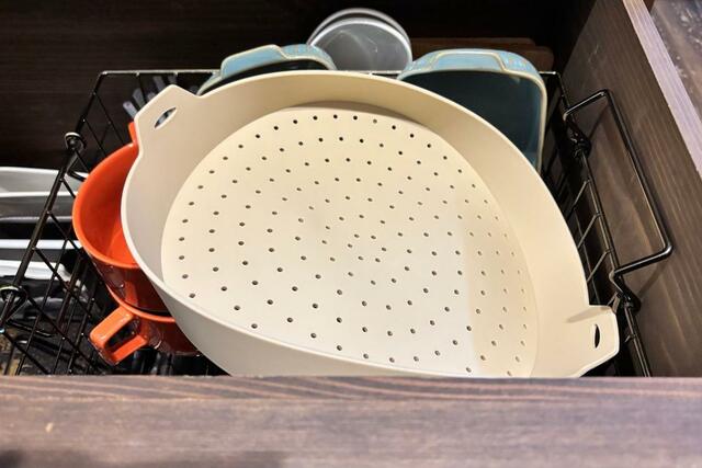 収納に場所を取らないのも推せるポイント。お皿と一緒にしまってもいいし、本体サイズが薄いので(足まで入れた高さは約6.7cm)引き出しの上部の隙間に置くこともできます。