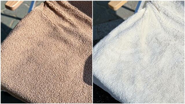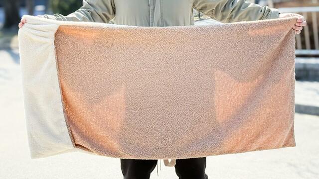 ブラウン側は、少しモコモコとしたムートンのようなあたたかみのある質感。一方のホワイト側は、寝具の毛布のように肌触りがよく、フワフワとしたやさしい仕上がりになっています。