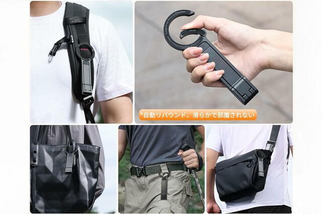 スマホにくっつける部分がカラビナになっているので、カバンやベルトループに引っ掛けて持ち歩けるのが面白いところ。