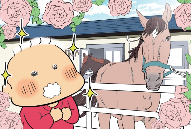 初めて遭遇したサラブレッドの美しさに、思わず見とれる2歳児…。 イラスト:Chacco