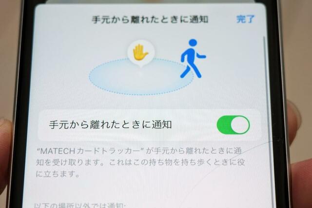 このアプリで特に便利だなと感じたのは、置き忘れ防止機能。トラッカーが自分から離れると通知が来るように設定できます。