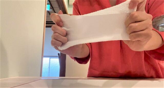 濡らして絞ると、飲食店で出てくるおしぼりみたいになりました。