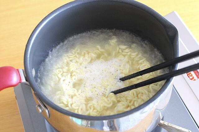 1. 鍋に湯を沸かし、辛ラーメンの乾麺を茹でる(4分30秒)