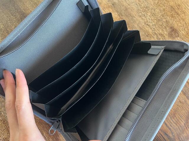 開いてみると、左手側にジャバラ式ポケットが6つあります。