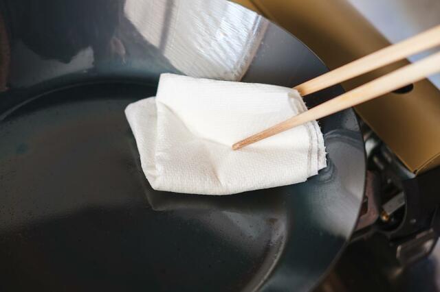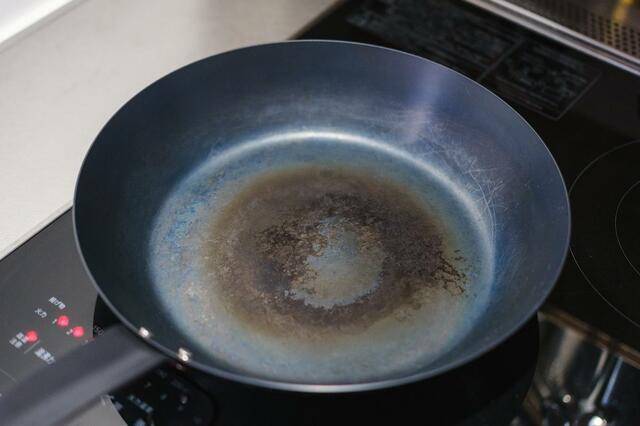 これにはフライパンの表面にある小さな穴に油を染み込ませることで、焦げつきにくく、そして錆びにくくする効果があり、以降の使い心地を左右する大事な作業です。