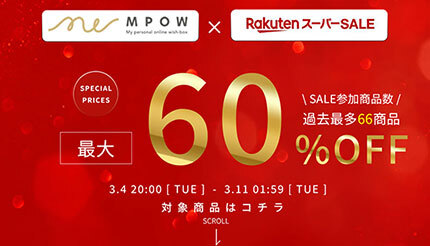 EPEIOS JAPANは3月11日1時59分まで、楽天市場で開催されている「楽天スーパーSALE」で計66アイテムを最大60%オフの特別価格で販売している。