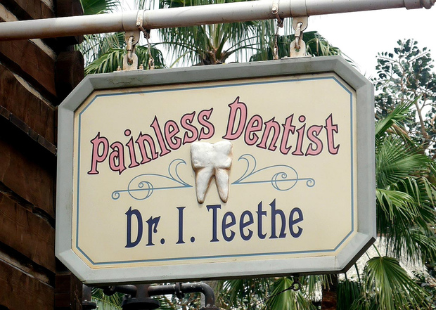 この建物には「歯」の形をした看板が掲げられており、さらに、「Painless Dentist」と書かれています。