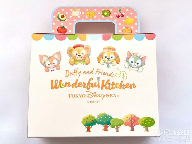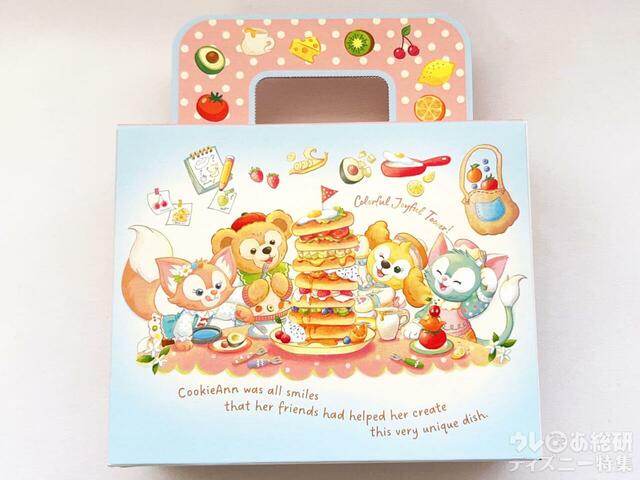 本体底:ダッフィーたちそれぞれのお顔とパンケーキ、食材、おリボンとロゴ。